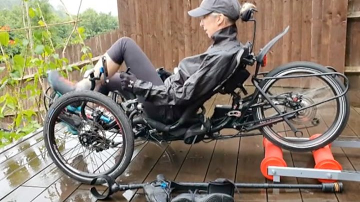 Ms Harris, an online advice manager for a housing charity, has been using a modified recumbent tricycle mounted on rollers to notch up the miles from home.